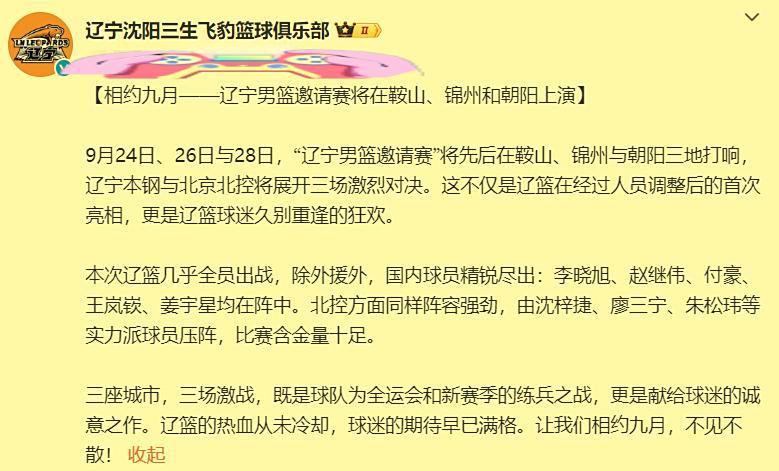 时间来到9月8日,上午10点整,辽篮正式官宣了这个月的邀请赛安排。将于24日、26日和28日分别在辽宁的鞍山、锦州和朝阳,与北控队进行三场热身赛。