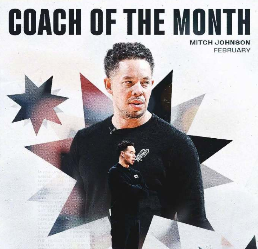 也就是说,整个2月份,马刺队的主教练和球员把各个奖项都拿到了,实现了大满贯。一整个2月份,马刺队拿到了11胜0负的战绩,确实是傲视群雄。作为对比,东部月最佳主教练是克利夫兰骑士队的主帅,他的执教战绩是8胜3负。
